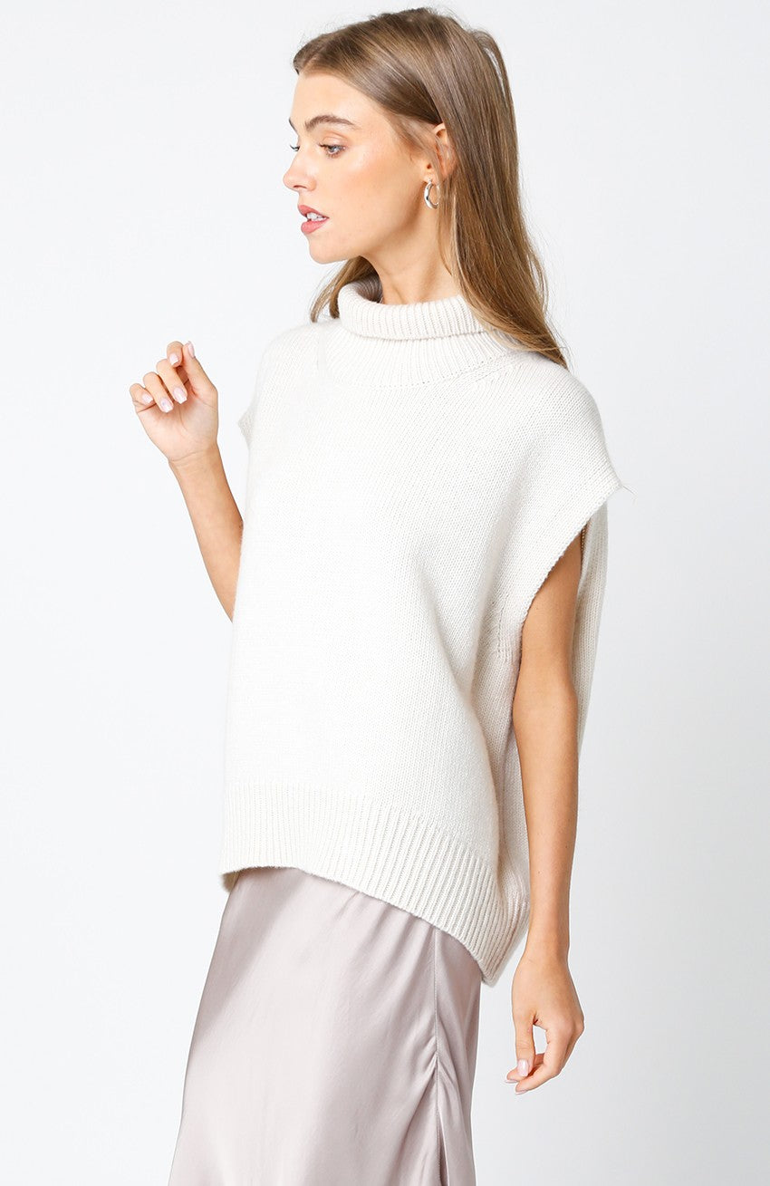 Indulge in effortless elegance with our Lovely Day Sleeveless Sweater. The cream color adds a touch of sophistication while the mock neck and draped fit give a chic and flattering look. Perfect for a lovely day out.