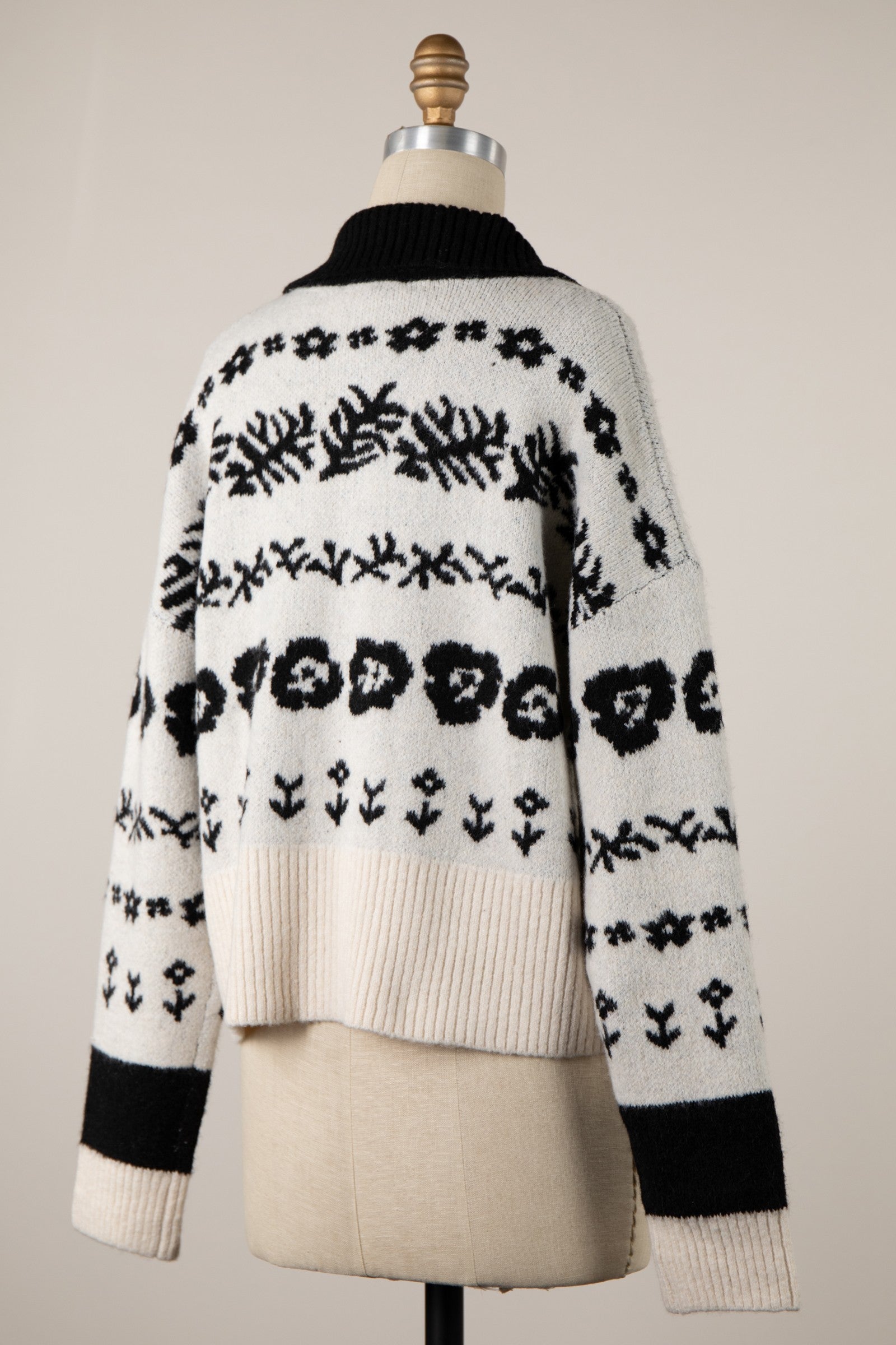 Cozy up in style with this playful Fair Isle sweater featuring a classic cream and black pattern. The contrasting collar and cuffs add a fun twist that’s perfect for brightening chilly days. Button front closure makes it easy to layer up or down, keeping you comfy and charming all season long.