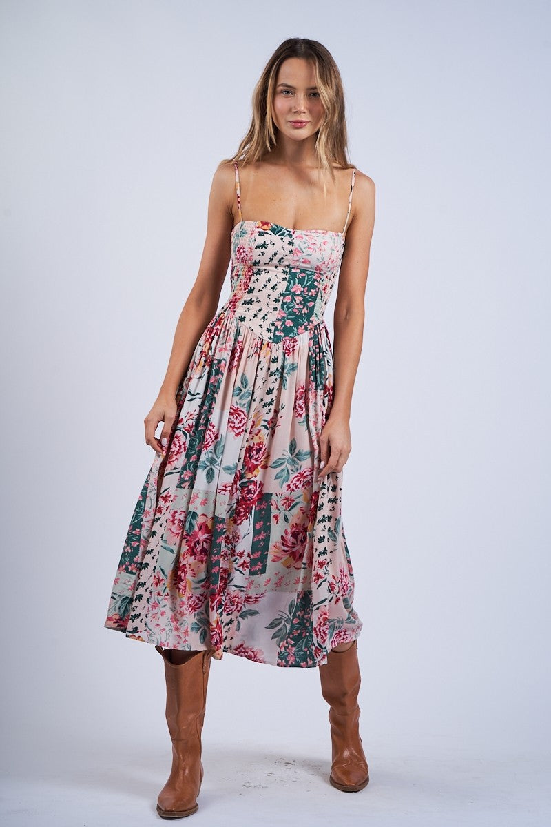 Embrace sunny days with this playful Floral Patch Print Sleeveless Midi Dress. The square neckline and adjustable straps add charm and a perfect fit, while the smocked torso offers comfort and flattering shape. Flowing to a midi length, this dress is ideal for twirling through summer adventures in style.