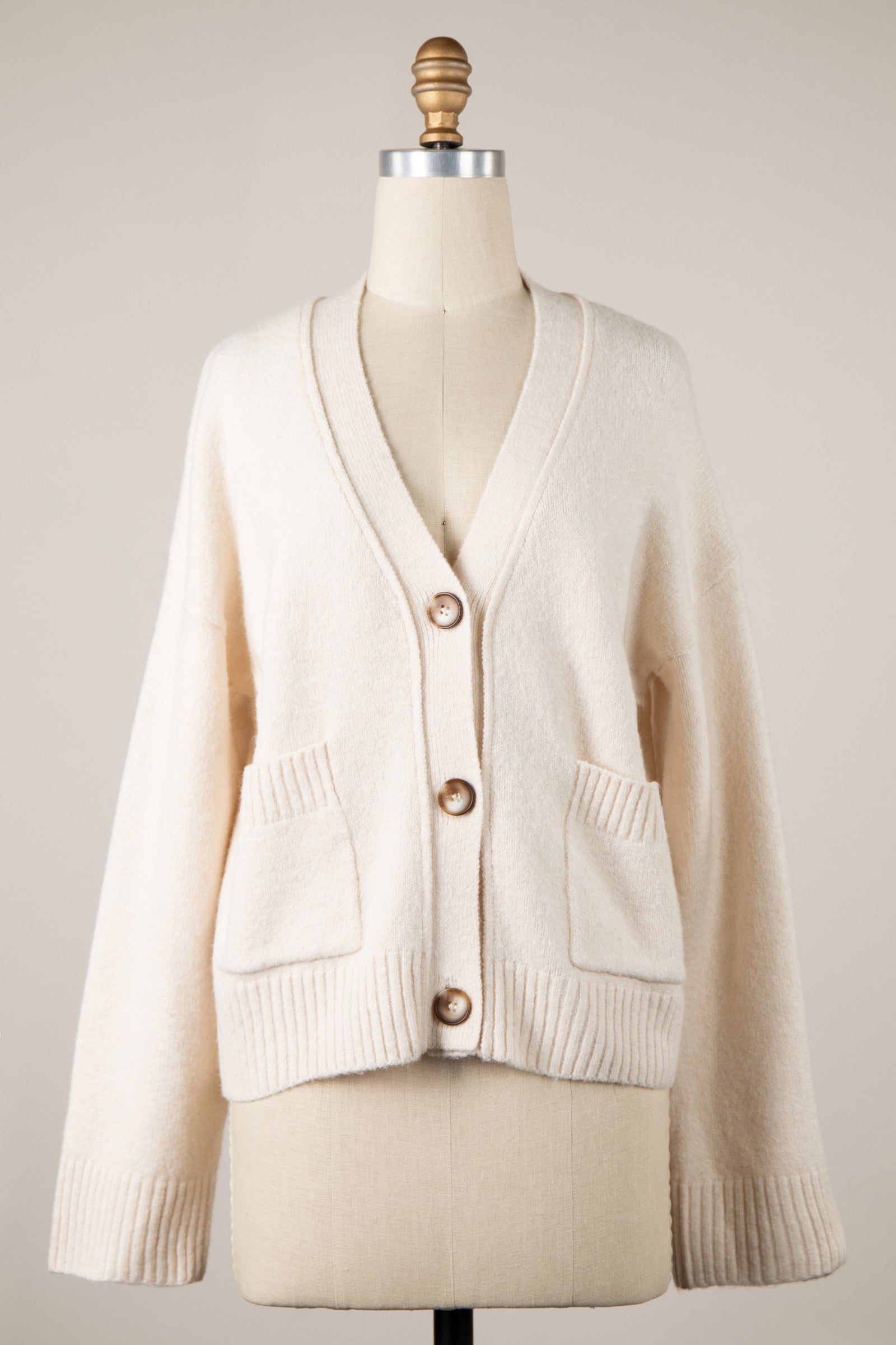 This Cream Soft Cardigan brings cozy vibes with a playful twist. Featuring a button-front and a flattering V-neck, it’s designed for easy layering. The square details add a fun edge, while the front pockets keep your essentials close and your hands warm. Perfect for those laid-back days when comfort meets style effortlessly!